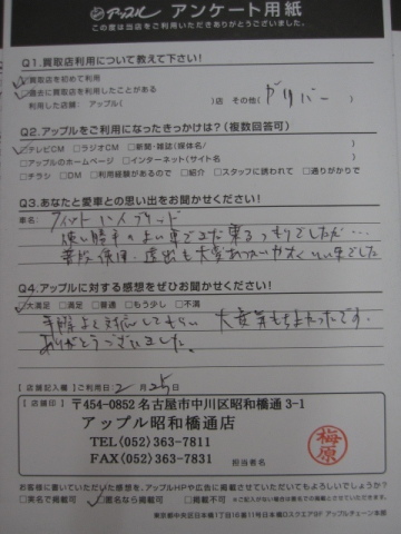 お車のご相談・ 査定だけでもOK! カンタン 入力 30秒 アップルがブランド買取始めました! お電話でも受付中! 受付時間10:00 ~ 19:00 052-363-7811 お車のご相談・ 査定だけでもOK! カンタン 入力 30秒 アップルがブランド買取始めました! お電話でも受付中! 受付時間10:00 ~ 19:00 052-363-7811 アップルがブランド買取始めました! お電話でも受付中! 受付時間10:00 ~ 19:00 052-363-7811 店舗情報 在庫車 スタッフ紹介 ブログ お客様の声 キャンペーン 無料査定 click お客様の声 ご記入日: 2017/06/06 匿名希望フィットハイブリッド様 手際よく対応してもらい、大変気持ちもよかったです。ありがとうございました。 前へ 次へ お客様の声一覧を見る