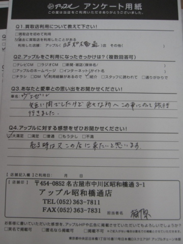 お車のご相談・ 査定だけでもOK! カンタン 入力 30秒 アップルがブランド買取始めました! お電話でも受付中! 受付時間10:00 ~ 19:00 052-363-7811 お車のご相談・ 査定だけでもOK! カンタン 入力 30秒 アップルがブランド買取始めました! お電話でも受付中! 受付時間10:00 ~ 19:00 052-363-7811 アップルがブランド買取始めました! お電話でも受付中! 受付時間10:00 ~ 19:00 052-363-7811 店舗情報 在庫車 スタッフ紹介 ブログ お客様の声 キャンペーン 無料査定 click お客様の声 ご記入日: 2017/06/06 匿名希望ヴェゼル様 売る時は又この店に来たいと思います。 前へ 次へ お客様の声一覧を見る
