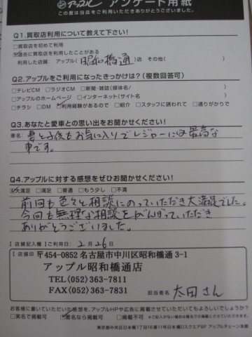 お車のご相談・ 査定だけでもOK! カンタン 入力 30秒 アップルがブランド買取始めました! お電話でも受付中! 受付時間10:00 ~ 19:00 052-363-7811 お車のご相談・ 査定だけでもOK! カンタン 入力 30秒 アップルがブランド買取始めました! お電話でも受付中! 受付時間10:00 ~ 19:00 052-363-7811 アップルがブランド買取始めました! お電話でも受付中! 受付時間10:00 ~ 19:00 052-363-7811 店舗情報 在庫車 スタッフ紹介 ブログ お客様の声 キャンペーン 無料査定 click お客様の声 ご記入日: 2017/06/06 匿名希望セレナ様 前回もいろいろと孫段にのっていただき大満足でした。今回も無理な相談をがんばっていただき、ありがとうございました。 前へ 次へ お客様の声一覧を見る