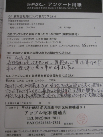 お車のご相談・ 査定だけでもOK! カンタン 入力 30秒 アップルがブランド買取始めました! お電話でも受付中! 受付時間10:00 ~ 19:00 052-363-7811 お車のご相談・ 査定だけでもOK! カンタン 入力 30秒 アップルがブランド買取始めました! お電話でも受付中! 受付時間10:00 ~ 19:00 052-363-7811 アップルがブランド買取始めました! お電話でも受付中! 受付時間10:00 ~ 19:00 052-363-7811 店舗情報 在庫車 スタッフ紹介 ブログ お客様の声 キャンペーン 無料査定 click お客様の声 ご記入日: 2017/06/06 匿名希望アウディA3様 初めてアップルを利用しましたが、皆スタッフの感じも良く、担当して下さったアドバイザーの方も最初まで、笑顔で親身になって対応してくれました。希望価格に近づける様、頑張ってくれたので大満足です。 前へ 次へ お客様の声一覧を見る