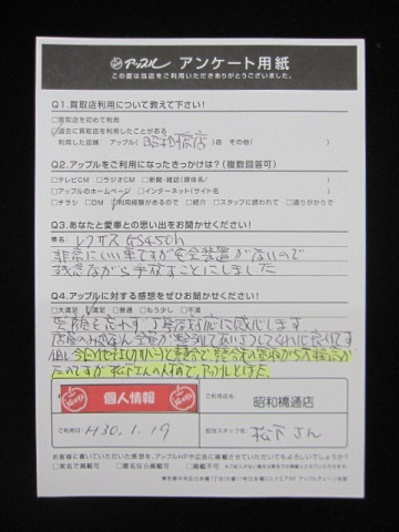 但し今回他社(ガリバー)と競合で、競合先の買取が5万程高かったのですが松下さんの人柄でアップルとしました。