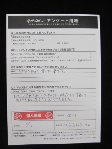 お車のご相談・ 査定だけでもOK! カンタン 入力 30秒 アップルがブランド買取始めました! お電話でも受付中! 受付時間10:00 ~ 19:00 052-363-7811 お車のご相談・ 査定だけでもOK! カンタン 入力 30秒 アップルがブランド買取始めました! お電話でも受付中! 受付時間10:00 ~ 19:00 052-363-7811 アップルがブランド買取始めました! お電話でも受付中! 受付時間10:00 ~ 19:00 052-363-7811 店舗情報 在庫車 スタッフ紹介 ブログ お客様の声 キャンペーン 無料査定 click お客様の声 ご記入日: 2018/03/11 匿名希望様 ものごしやらかいスタッフに対応して頂いて気持ちよく売ることができました。 前へ 次へ お客様の声一覧を見る