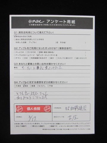 お車のご相談・ 査定だけでもOK! カンタン 入力 30秒 アップルがブランド買取始めました! お電話でも受付中! 受付時間10:00 ~ 19:00 052-363-7811 お車のご相談・ 査定だけでもOK! カンタン 入力 30秒 アップルがブランド買取始めました! お電話でも受付中! 受付時間10:00 ~ 19:00 052-363-7811 アップルがブランド買取始めました! お電話でも受付中! 受付時間10:00 ~ 19:00 052-363-7811 店舗情報 在庫車 スタッフ紹介 ブログ お客様の声 キャンペーン 無料査定 click お客様の声 ご記入日: 2018/03/17 匿名希望様 とても良い対応でした。ありがとうございます。 前へ 次へ お客様の声一覧を見る