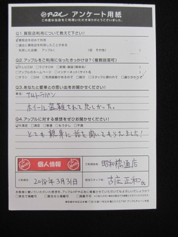 お車のご相談・ 査定だけでもOK! カンタン 入力 30秒 アップルがブランド買取始めました! お電話でも受付中! 受付時間10:00 ~ 19:00 052-363-7811 お車のご相談・ 査定だけでもOK! カンタン 入力 30秒 アップルがブランド買取始めました! お電話でも受付中! 受付時間10:00 ~ 19:00 052-363-7811 アップルがブランド買取始めました! お電話でも受付中! 受付時間10:00 ~ 19:00 052-363-7811 店舗情報 在庫車 スタッフ紹介 ブログ お客様の声 キャンペーン 無料査定 click お客様の声 ご記入日: 2018/03/31 アルトラパン匿名希望様 とても親身に話を聞いてもらえました! 前へ 次へ お客様の声一覧を見る