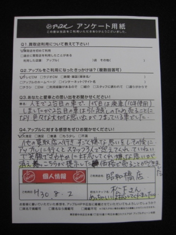 お車のご相談・ 査定だけでもOK! カンタン 入力 30秒 アップルがブランド買取始めました! お電話でも受付中! 受付時間10:00 ~ 19:00 052-363-7811 お車のご相談・ 査定だけでもOK! カンタン 入力 30秒 アップルがブランド買取始めました! お電話でも受付中! 受付時間10:00 ~ 19:00 052-363-7811 アップルがブランド買取始めました! お電話でも受付中! 受付時間10:00 ~ 19:00 052-363-7811 店舗情報 在庫車 スタッフ紹介 ブログ お客様の声 キャンペーン 無料査定 click お客様の声 ご記入日: 2018/08/02 匿名希望様 他の買取店へ行き、すごく嫌な思いをし、その後にアップルに行くと、スタッフ3人で迎えてくれ、ていねいで笑顔でさわやかに対応してくれ、嫌な思いが消え、こちらが提示した価格で売る事ができました。 前へ 次へ お客様の声一覧を見る