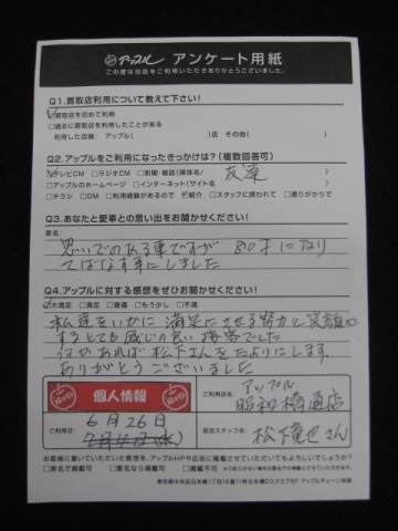 お車のご相談・ 査定だけでもOK! カンタン 入力 30秒 アップルがブランド買取始めました! お電話でも受付中! 受付時間10:00 ~ 19:00 052-363-7811 お車のご相談・ 査定だけでもOK! カンタン 入力 30秒 アップルがブランド買取始めました! お電話でも受付中! 受付時間10:00 ~ 19:00 052-363-7811 アップルがブランド買取始めました! お電話でも受付中! 受付時間10:00 ~ 19:00 052-363-7811 店舗情報 在庫車 スタッフ紹介 ブログ お客様の声 キャンペーン 無料査定 click お客様の声 ご記入日: 2018/06/26 匿名希望様 私達をいかに満足にさせる努力と笑顔にするとても感じの良い接客でした何かあれば松下さんをたよりにします。ありがとうございました 前へ 次へ お客様の声一覧を見る