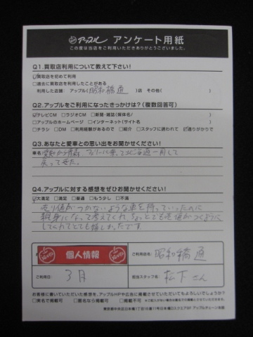 お車のご相談・ 査定だけでもOK! カンタン 入力 30秒 アップルがブランド買取始めました! お電話でも受付中! 受付時間10:00 ~ 19:00 052-363-7811 お車のご相談・ 査定だけでもOK! カンタン 入力 30秒 アップルがブランド買取始めました! お電話でも受付中! 受付時間10:00 ~ 19:00 052-363-7811 アップルがブランド買取始めました! お電話でも受付中! 受付時間10:00 ~ 19:00 052-363-7811 店舗情報 在庫車 スタッフ紹介 ブログ お客様の声 キャンペーン 無料査定 click お客様の声 ご記入日: 2018/03/31 匿名希望様 売値がつかないような車を持っていったのに親身になって考えてくれ、ちょっとでも売値がつくようにしてくれてとても嬉しかったです。 前へ 次へ お客様の声一覧を見る