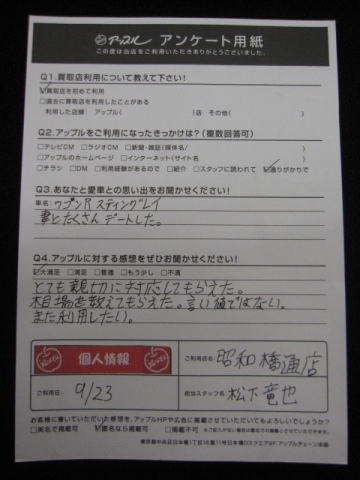 お車のご相談・ 査定だけでもOK! カンタン 入力 30秒 アップルがブランド買取始めました! お電話でも受付中! 受付時間10:00 ~ 19:00 052-363-7811 お車のご相談・ 査定だけでもOK! カンタン 入力 30秒 アップルがブランド買取始めました! お電話でも受付中! 受付時間10:00 ~ 19:00 052-363-7811 アップルがブランド買取始めました! お電話でも受付中! 受付時間10:00 ~ 19:00 052-363-7811 店舗情報 在庫車 スタッフ紹介 ブログ お客様の声 キャンペーン 無料査定 click お客様の声 ご記入日: 2018/09/23 ワゴンRスティングレー匿名希望様 とても親切に対応してもらえた。相場を教えてもらえた。言い値ではない。また利用したい。 前へ 次へ お客様の声一覧を見る