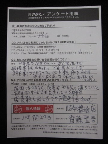 お車のご相談・ 査定だけでもOK! カンタン 入力 30秒 アップルがブランド買取始めました! お電話でも受付中! 受付時間10:00 ~ 19:00 052-363-7811 お車のご相談・ 査定だけでもOK! カンタン 入力 30秒 アップルがブランド買取始めました! お電話でも受付中! 受付時間10:00 ~ 19:00 052-363-7811 アップルがブランド買取始めました! お電話でも受付中! 受付時間10:00 ~ 19:00 052-363-7811 店舗情報 在庫車 スタッフ紹介 ブログ お客様の声 キャンペーン 無料査定 click お客様の声 ご記入日: 2018/09/24 エスティマ匿名希望様 店内は明るく、店員もやる気に満ちていて飲み物サービスも充実している☆☆☆店員数人出てきてのお見送りもGood 前へ 次へ お客様の声一覧を見る