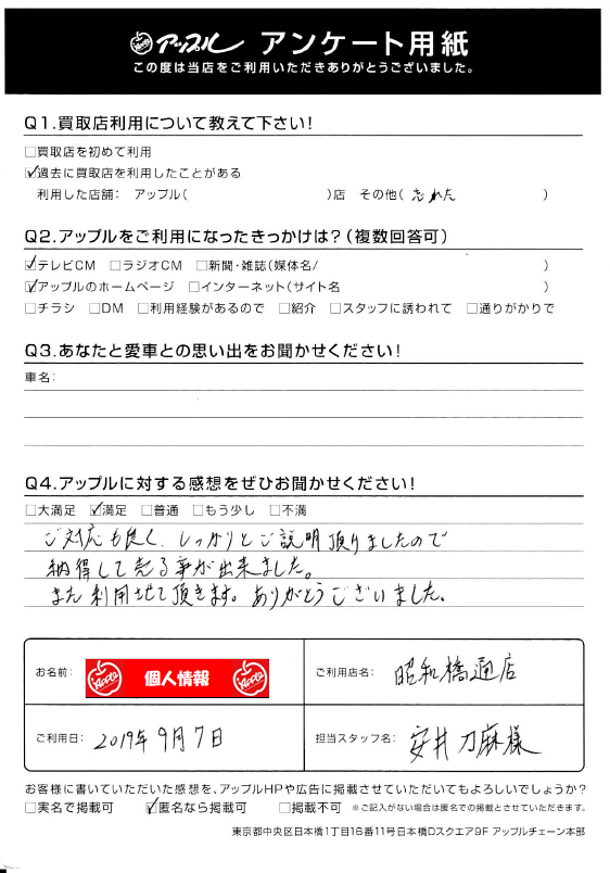 お車のご相談・ 査定だけでもOK! カンタン 入力 30秒 アップルがブランド買取始めました! お電話でも受付中! 受付時間10:00 ~ 19:00 052-363-7811 お車のご相談・ 査定だけでもOK! カンタン 入力 30秒 アップルがブランド買取始めました! お電話でも受付中! 受付時間10:00 ~ 19:00 052-363-7811 アップルがブランド買取始めました! お電話でも受付中! 受付時間10:00 ~ 19:00 052-363-7811 店舗情報 在庫車 スタッフ紹介 ブログ お客様の声 キャンペーン 無料査定 click お客様の声 ご記入日: 2019/09/07 匿名希望様 ご対応も良くしっかりとご説明頂けましたので納得して売る事が出来ました。また利用させて頂きます。ありがとうございました。 前へ 次へ お客様の声一覧を見る