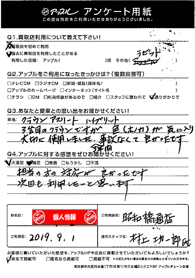 お車のご相談・ 査定だけでもOK! カンタン 入力 30秒 アップルがブランド買取始めました! お電話でも受付中! 受付時間10:00 ~ 19:00 052-363-7811 お車のご相談・ 査定だけでもOK! カンタン 入力 30秒 アップルがブランド買取始めました! お電話でも受付中! 受付時間10:00 ~ 19:00 052-363-7811 アップルがブランド買取始めました! お電話でも受付中! 受付時間10:00 ~ 19:00 052-363-7811 店舗情報 在庫車 スタッフ紹介 ブログ お客様の声 キャンペーン 無料査定 click お客様の声 ご記入日: 2019/09/01 匿名希望様 車名:トヨタ クラウンアスリート (H11年9月~H30年6月) 担当の方の対応が良かったです次回も利用したいと思います 前へ 次へ お客様の声一覧を見る