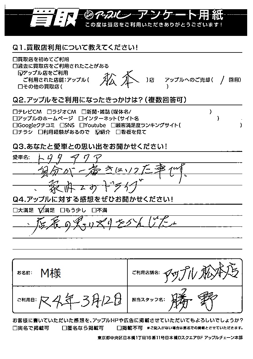 お車のご相談・ 査定だけでもOK! カンタン 入力 30秒 アップルがブランド買取始めました! お電話でも受付中! 受付時間10:00 ~ 19:00 0263-24-2433 お車のご相談・ 査定だけでもOK! カンタン 入力 30秒 アップルがブランド買取始めました! お電話でも受付中! 受付時間10:00 ~ 19:00 0263-24-2433 アップルがブランド買取始めました! お電話でも受付中! 受付時間10:00 ~ 19:00 0263-24-2433 店舗情報 在庫車 スタッフ紹介 ブログ お客様の声 キャンペーン 無料査定 click お客様の声 ご記入日: 2022/03/12 M様 車名:トヨタ アクア Q あなたと愛車との思い出をお聞かせください!自分が一番きにいった車です。家内とのドライブQ アップルに対する感想をぜひお聞かせください!感想:満足店長の思いやりをかんじた。 前へ 次へ お客様の声一覧を見る