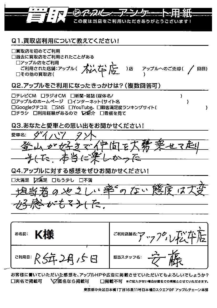K様 車名:ダイハツ タント
