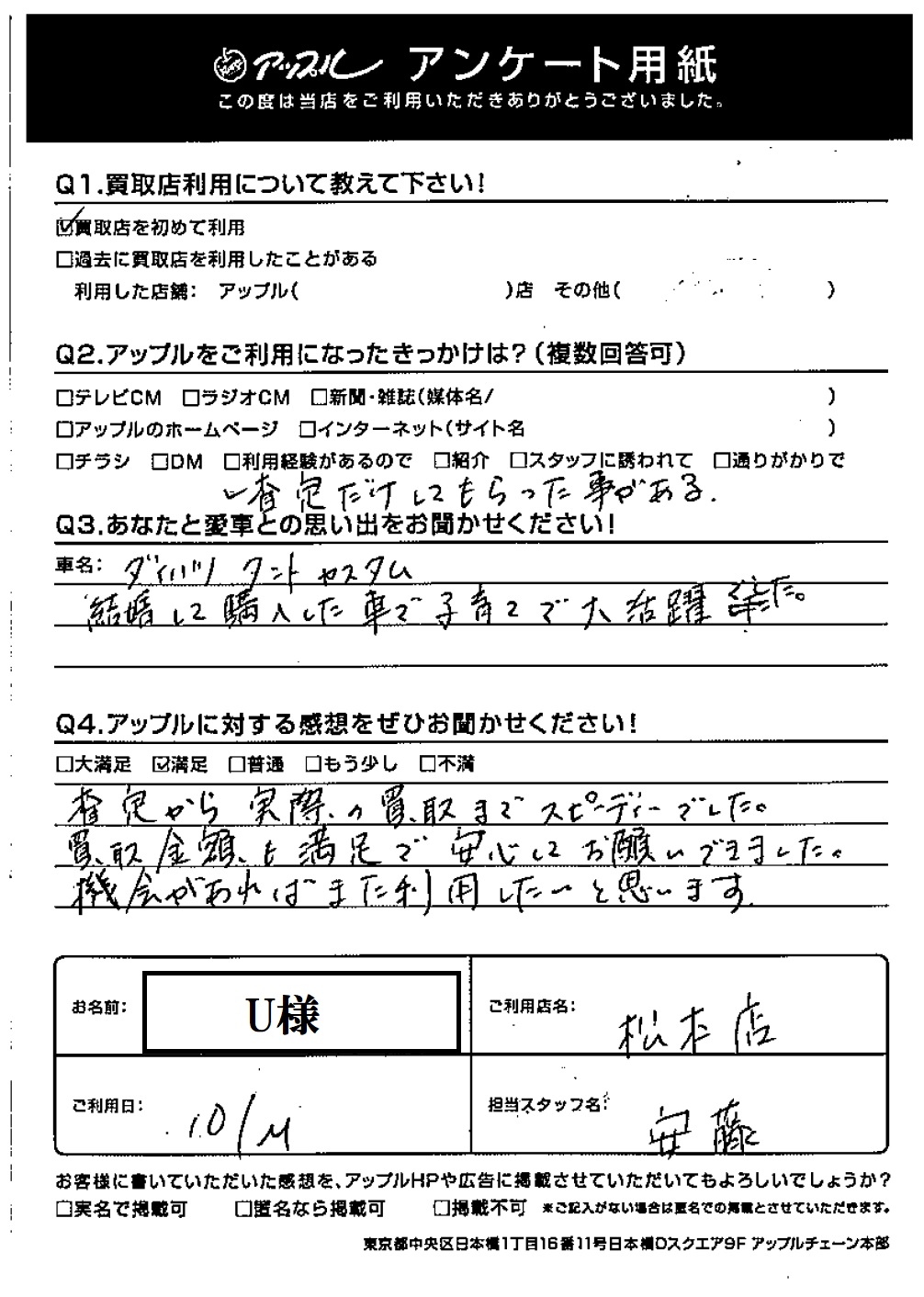 お車のご相談・ 査定だけでもOK! カンタン 入力 30秒 アップルがブランド買取始めました! お電話でも受付中! 受付時間10:00 ~ 19:00 0263-24-2433 お車のご相談・ 査定だけでもOK! カンタン 入力 30秒 アップルがブランド買取始めました! お電話でも受付中! 受付時間10:00 ~ 19:00 0263-24-2433 アップルがブランド買取始めました! お電話でも受付中! 受付時間10:00 ~ 19:00 0263-24-2433 店舗情報 在庫車 スタッフ紹介 ブログ お客様の声 キャンペーン 無料査定 click お客様の声 ご記入日: 2020/10/13 U様 車名:ダイハツ タント 感想:満足査定から実際の買取までスピーディでした。買取金額も満足で安心してお願いできました。機会があればまた利用したいと思います。 前へ 次へ お客様の声一覧を見る