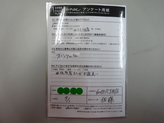 お車のご相談・ 査定だけでもOK! カンタン 入力 30秒 アップルがブランド買取始めました! お電話でも受付中! 受付時間10:00 ~ 19:00 022-782-8933 お車のご相談・ 査定だけでもOK! カンタン 入力 30秒 アップルがブランド買取始めました! お電話でも受付中! 受付時間10:00 ~ 19:00 022-782-8933 アップルがブランド買取始めました! お電話でも受付中! 受付時間10:00 ~ 19:00 022-782-8933 店舗情報 在庫車 スタッフ紹介 ブログ お客様の声 キャンペーン 無料査定 click お客様の声 ご記入日: 2021/09/01 宮城県仙台市 匿名希望 U様 車名:スズキ ジムニー Q1.あなたと愛車との思い出をお聞かせください!A.オリジナル感Q2.アップルに対する感想をお聞かせください!A.担当者さんが大変良い 前へ 次へ お客様の声一覧を見る