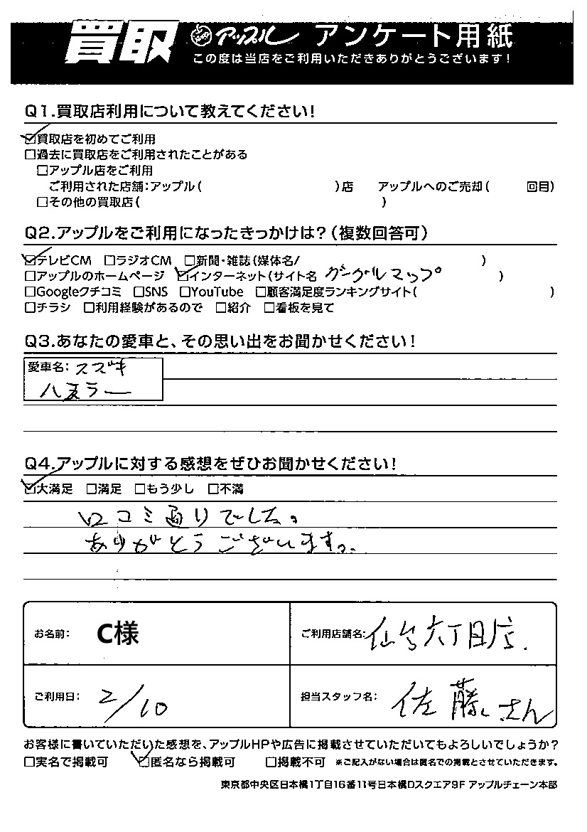 お車のご相談・ 査定だけでもOK! カンタン 入力 30秒 アップルがブランド買取始めました! お電話でも受付中! 受付時間10:00 ~ 19:00 022-782-8933 お車のご相談・ 査定だけでもOK! カンタン 入力 30秒 アップルがブランド買取始めました! お電話でも受付中! 受付時間10:00 ~ 19:00 022-782-8933 アップルがブランド買取始めました! お電話でも受付中! 受付時間10:00 ~ 19:00 022-782-8933 店舗情報 在庫車 スタッフ紹介 ブログ お客様の声 キャンペーン 無料査定 click お客様の声 ご記入日: 2025/02/10 匿名希望 C様 車名:スズキ ハスラー Q:アップルに対する感想をぜひお聞かせください!大満足口コミ通りでした。ありがとうございます。 前へ 次へ お客様の声一覧を見る
