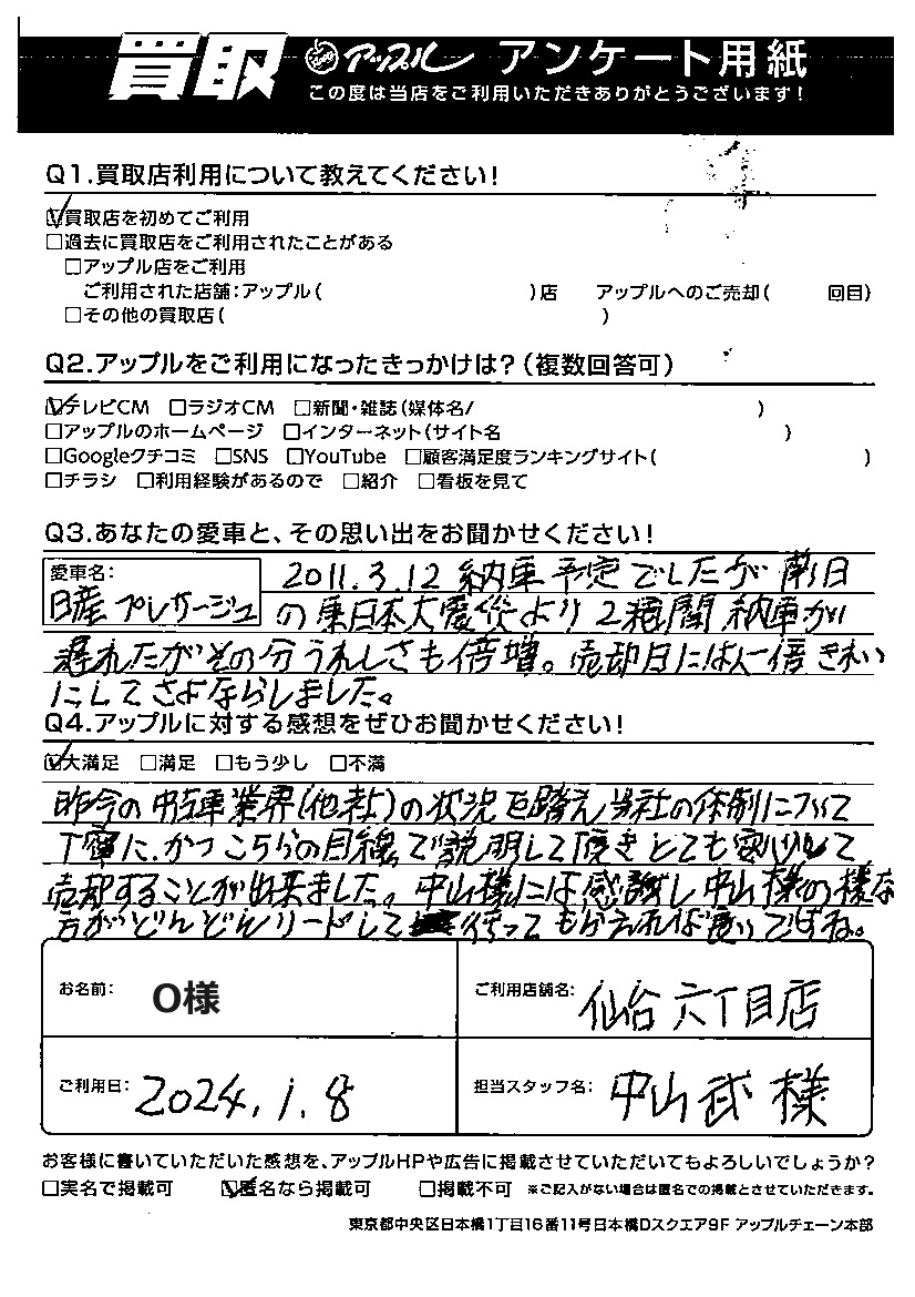 昨今の中古車業界(他社)の状況を踏まえ当社の体制について丁寧に、かつこちらの目線で説明して頂きとても安心して売却することが出来ました。中山様には感謝し中山様の様な方がどんどんリードして行ってもらえれば良いですね。