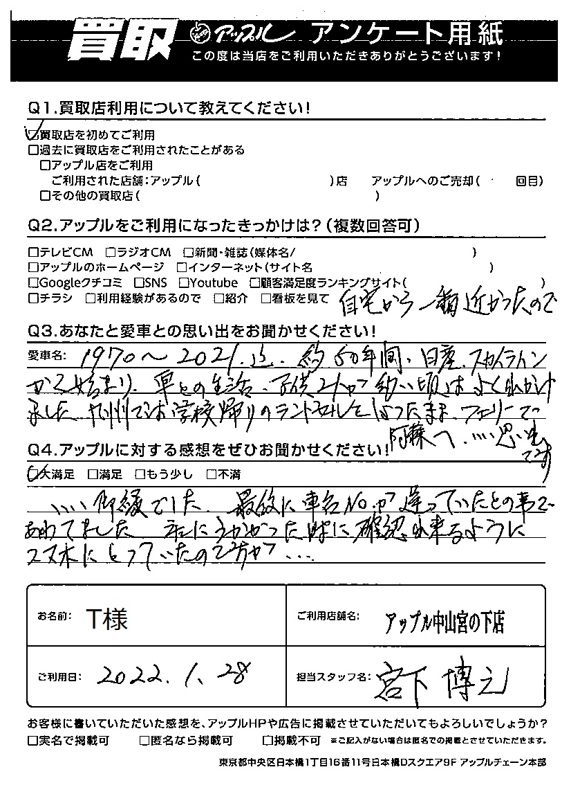 お車のご相談・ 査定だけでもOK! カンタン 入力 30秒 アップルがブランド買取始めました! お電話でも受付中! 受付時間10:00 ~ 19:00(最終受付は18:30となります) 045-929-2211 お車のご相談・ 査定だけでもOK! カンタン 入力 30秒 アップルがブランド買取始めました! お電話でも受付中! 受付時間10:00 ~ 19:00(最終受付は18:30となります) 045-929-2211 アップルがブランド買取始めました! お電話でも受付中! 受付時間10:00 ~ 19:00(最終受付は18:30となります) 045-929-2211 店舗情報 在庫車 スタッフ紹介 ブログ お客様の声 キャンペーン お得 無料査定 click お客様の声 ご記入日: 2022/01/28 横浜市 T様 車名:トヨタ プレミオ T様ご利用いただきありがとうございました。大切な思い出が詰まった愛車を手放す事となり御依頼頂きました。T様ご家族皆様お人柄も温かったので担当出来た事を嬉しく思います。ありがとうございました。 前へ 次へ お客様の声一覧を見る