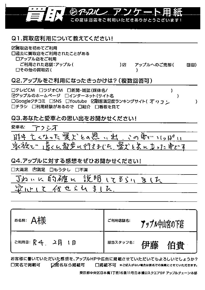 お車のご相談・ 査定だけでもOK! カンタン 入力 30秒 アップルがブランド買取始めました! お電話でも受付中! 受付時間10:00 ~ 19:00(最終受付は18:30となります) 045-929-2211 お車のご相談・ 査定だけでもOK! カンタン 入力 30秒 アップルがブランド買取始めました! お電話でも受付中! 受付時間10:00 ~ 19:00(最終受付は18:30となります) 045-929-2211 アップルがブランド買取始めました! お電話でも受付中! 受付時間10:00 ~ 19:00(最終受付は18:30となります) 045-929-2211 店舗情報 在庫車 スタッフ紹介 ブログ お客様の声 キャンペーン お得 無料査定 click お客様の声 ご記入日: 2022/02/01 A様 車名:トヨタ カローラアクシオ この度は、アップル中山宮の下店をご利用頂き誠にありがとうございました。愛車のご売却先をどの店舗にするか迷われていましたが、最後に当店を信用してご売却頂いた事を大変うれしく思います。次回も機会がございましたらぜひまた当店にご相談下さい。 前へ 次へ お客様の声一覧を見る