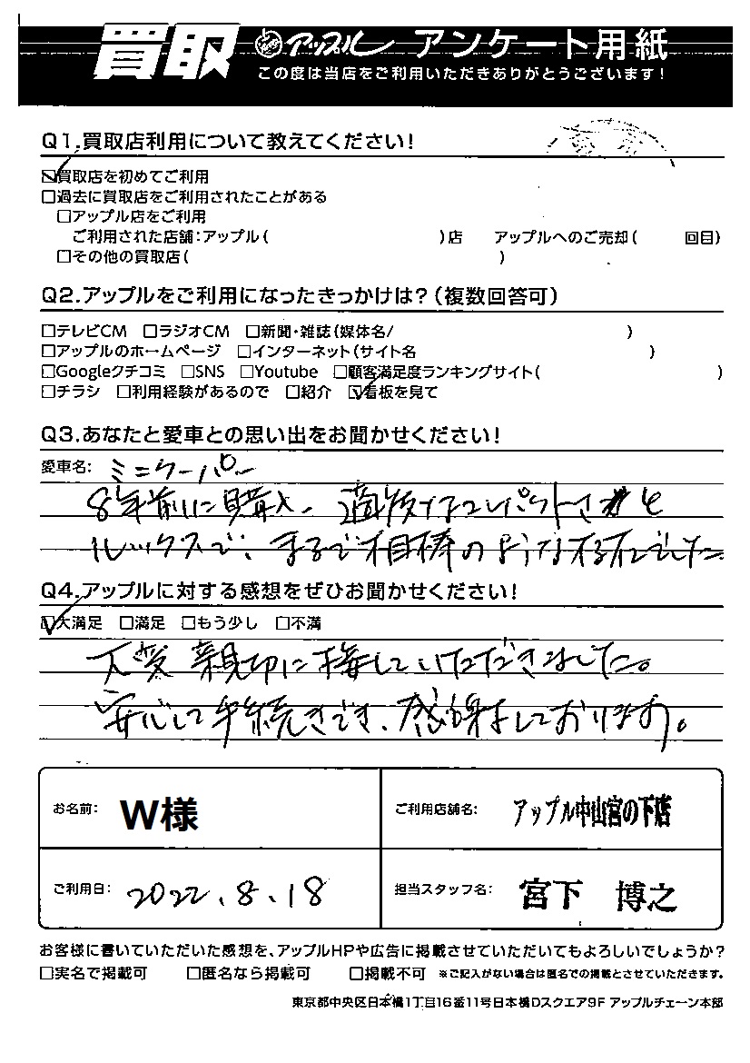 お車のご相談・ 査定だけでもOK! カンタン 入力 30秒 アップルがブランド買取始めました! お電話でも受付中! 受付時間10:00 ~ 19:00(最終受付は18:30となります) 045-929-2211 お車のご相談・ 査定だけでもOK! カンタン 入力 30秒 アップルがブランド買取始めました! お電話でも受付中! 受付時間10:00 ~ 19:00(最終受付は18:30となります) 045-929-2211 アップルがブランド買取始めました! お電話でも受付中! 受付時間10:00 ~ 19:00(最終受付は18:30となります) 045-929-2211 店舗情報 在庫車 スタッフ紹介 ブログ お客様の声 キャンペーン お得 無料査定 click お客様の声 ご記入日: 2022/08/18 横浜市 W様 車名:ミニ ミニ W様はお引越しで、かわいがっていた愛車を譲って頂く事になりお手続きをお任せいただけました。安心してお任せ頂けたとの事で担当者として嬉しく思います。ご利用いただきありがとうございました。 前へ 次へ お客様の声一覧を見る