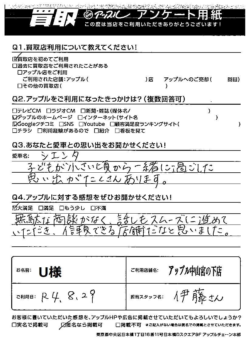 お車のご相談・ 査定だけでもOK! カンタン 入力 30秒 アップルがブランド買取始めました! お電話でも受付中! 受付時間10:00 ~ 19:00(最終受付は18:30となります) 045-929-2211 お車のご相談・ 査定だけでもOK! カンタン 入力 30秒 アップルがブランド買取始めました! お電話でも受付中! 受付時間10:00 ~ 19:00(最終受付は18:30となります) 045-929-2211 アップルがブランド買取始めました! お電話でも受付中! 受付時間10:00 ~ 19:00(最終受付は18:30となります) 045-929-2211 店舗情報 在庫車 スタッフ紹介 ブログ お客様の声 キャンペーン お得 無料査定 click お客様の声 ご記入日: 2022/08/29 U様様 車名:トヨタ シエンタ この度はたくさん家族の思い出がつまった愛車をアップル中山宮の下にご売却頂き、誠にありがとうございました。また、当店を信用してご売却頂き、大変嬉しく思います。まだ先のお話にはなると思いますが、次回もお車の買換えの際は、是非また当店にご相談下さい。 前へ 次へ お客様の声一覧を見る