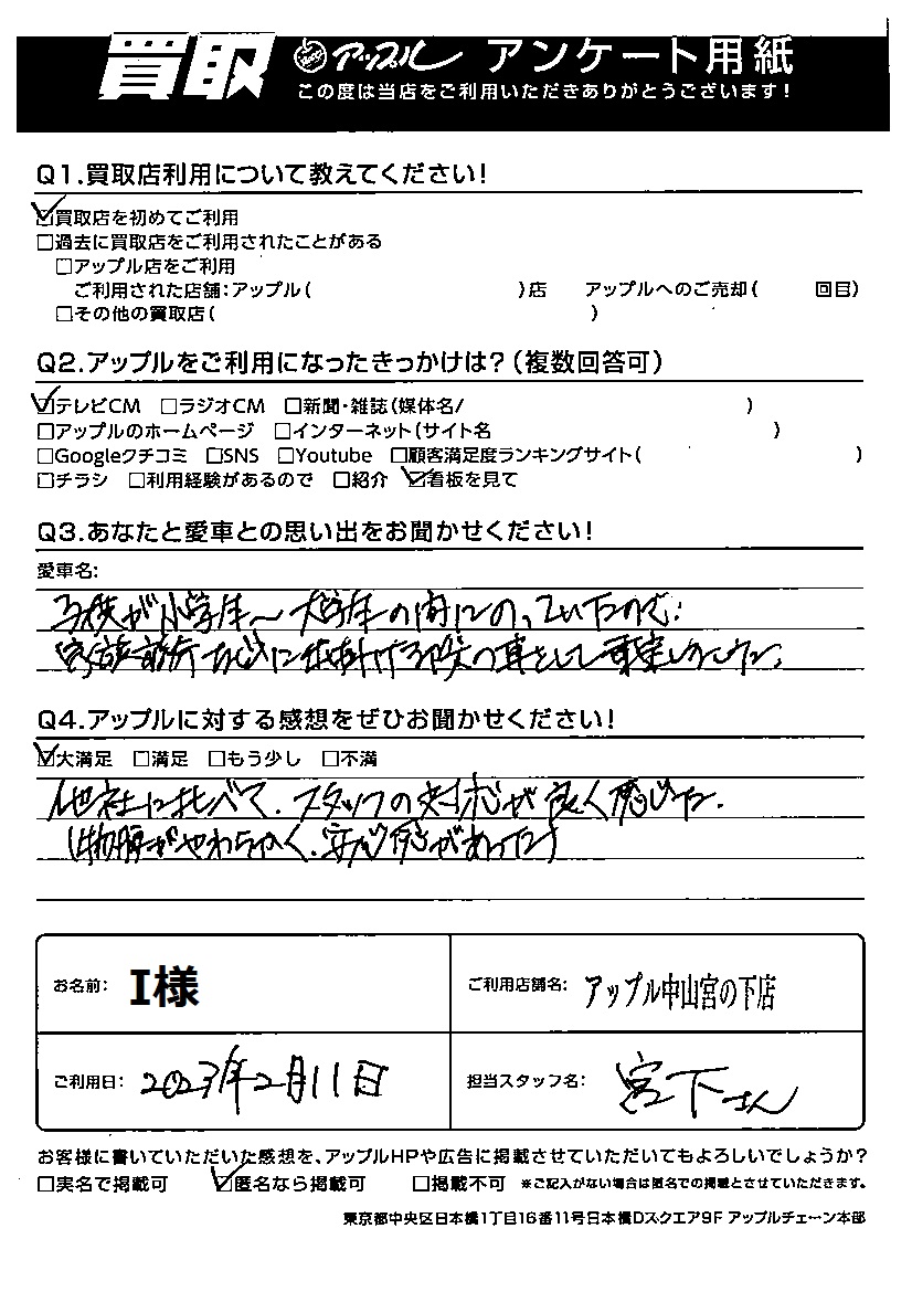 お車のご相談・ 査定だけでもOK! カンタン 入力 30秒 アップルがブランド買取始めました! お電話でも受付中! 受付時間10:00 ~ 19:00(最終受付は18:30となります) 045-929-2211 お車のご相談・ 査定だけでもOK! カンタン 入力 30秒 アップルがブランド買取始めました! お電話でも受付中! 受付時間10:00 ~ 19:00(最終受付は18:30となります) 045-929-2211 アップルがブランド買取始めました! お電話でも受付中! 受付時間10:00 ~ 19:00(最終受付は18:30となります) 045-929-2211 店舗情報 在庫車 スタッフ紹介 ブログ お客様の声 キャンペーン お得 無料査定 click お客様の声 ご記入日: 2023/02/11 横浜市 I様 車名:トヨタ エスティマ I様の思い出が一杯詰まった愛車をお譲り頂きありがとうございます。お子様の成長になりご売却頂きました。またのご利用お待ちしております。 前へ 次へ お客様の声一覧を見る