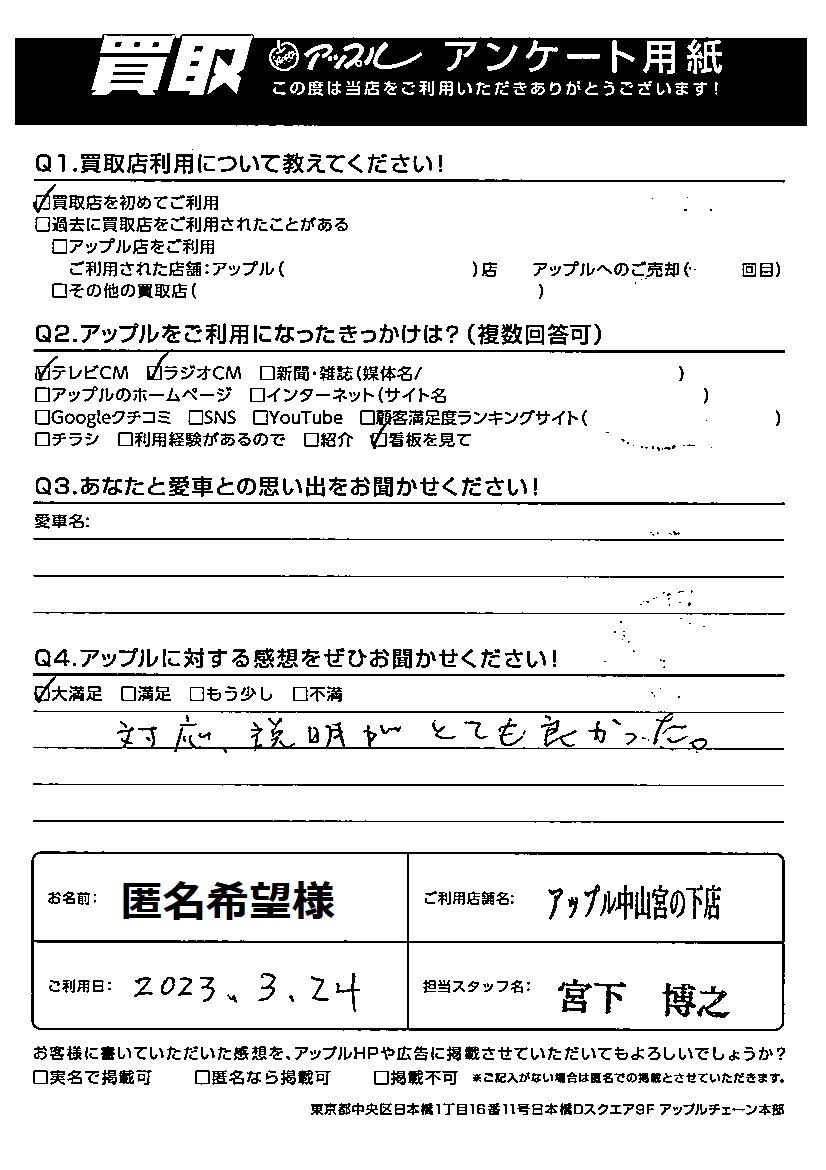 お車のご相談・ 査定だけでもOK! カンタン 入力 30秒 アップルがブランド買取始めました! お電話でも受付中! 受付時間10:00 ~ 19:00(最終受付は18:30となります) 045-929-2211 お車のご相談・ 査定だけでもOK! カンタン 入力 30秒 アップルがブランド買取始めました! お電話でも受付中! 受付時間10:00 ~ 19:00(最終受付は18:30となります) 045-929-2211 アップルがブランド買取始めました! お電話でも受付中! 受付時間10:00 ~ 19:00(最終受付は18:30となります) 045-929-2211 店舗情報 在庫車 スタッフ紹介 ブログ お客様の声 キャンペーン お得 無料査定 click お客様の声 ご記入日: 2023/03/24 横浜市 N様 車名:日産 エクストレイル 大切にされていた愛車のご売却頂きましてありがとうございました。又のご相談お待ちしております。 前へ 次へ お客様の声一覧を見る
