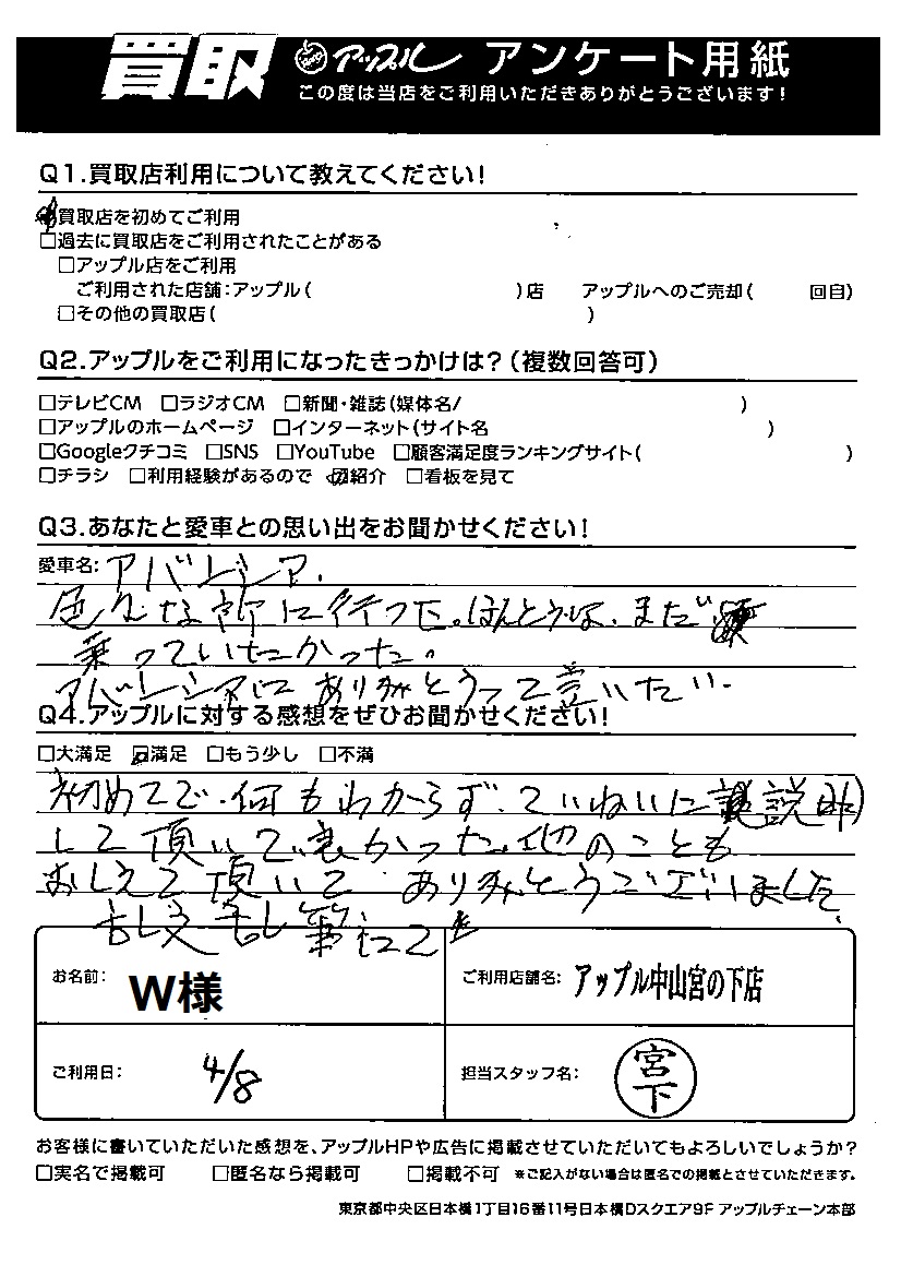 お車のご相談・ 査定だけでもOK! カンタン 入力 30秒 アップルがブランド買取始めました! お電話でも受付中! 受付時間10:00 ~ 19:00(最終受付は18:30となります) 045-929-2211 お車のご相談・ 査定だけでもOK! カンタン 入力 30秒 アップルがブランド買取始めました! お電話でも受付中! 受付時間10:00 ~ 19:00(最終受付は18:30となります) 045-929-2211 アップルがブランド買取始めました! お電話でも受付中! 受付時間10:00 ~ 19:00(最終受付は18:30となります) 045-929-2211 店舗情報 在庫車 スタッフ紹介 ブログ お客様の声 キャンペーン お得 無料査定 click お客様の声 ご記入日: 2023/04/08 横浜市 W様 車名:ホンダ アヴァンシア W様の最後の愛車をお譲り頂きましてありがとうございました。免許返納のタイミングで愛車をお譲り頂きました。長期の渡り安全運転お疲れ様でした。 前へ 次へ お客様の声一覧を見る