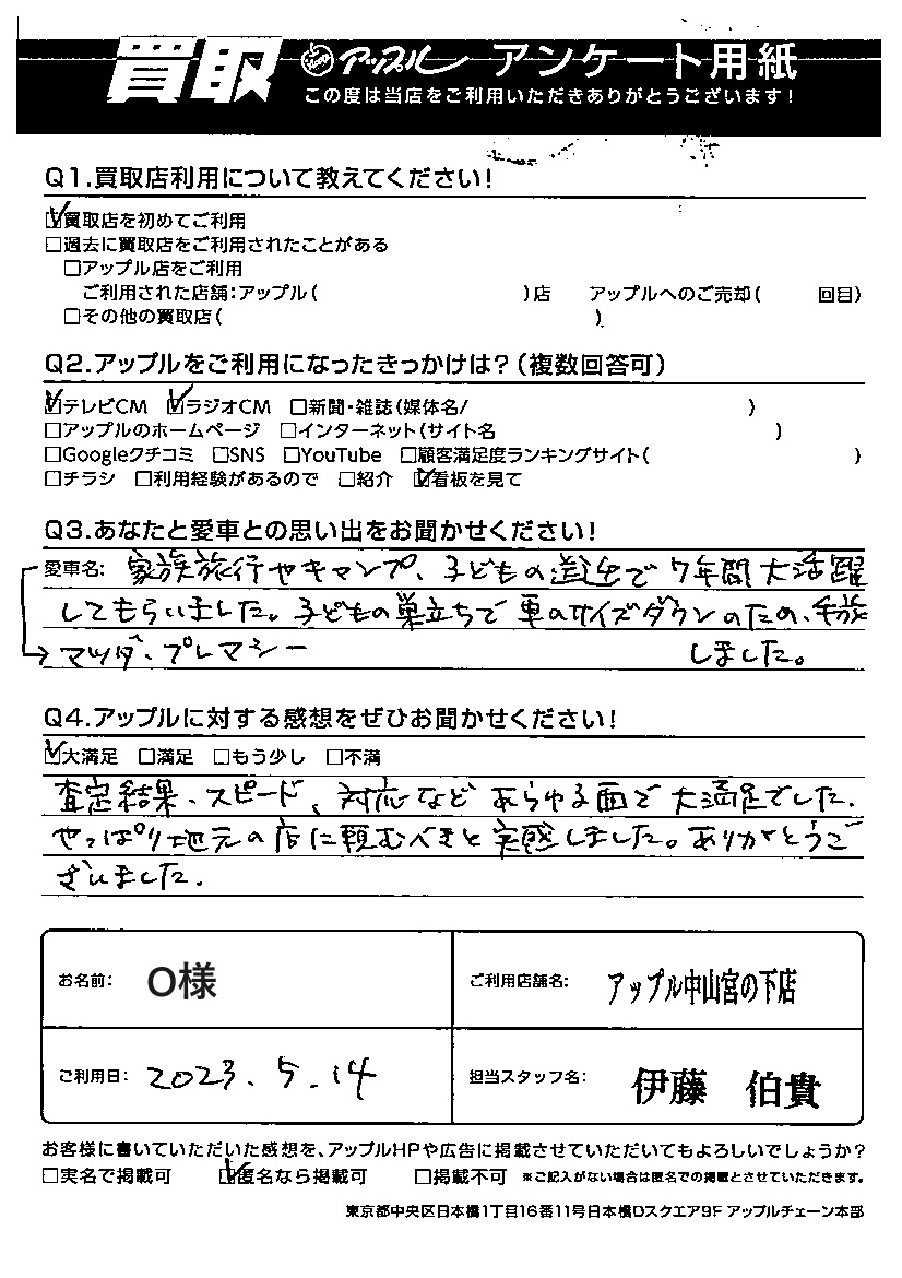 お車のご相談・ 査定だけでもOK! カンタン 入力 30秒 アップルがブランド買取始めました! お電話でも受付中! 受付時間10:00 ~ 19:00(最終受付は18:30となります) 045-929-2211 お車のご相談・ 査定だけでもOK! カンタン 入力 30秒 アップルがブランド買取始めました! お電話でも受付中! 受付時間10:00 ~ 19:00(最終受付は18:30となります) 045-929-2211 アップルがブランド買取始めました! お電話でも受付中! 受付時間10:00 ~ 19:00(最終受付は18:30となります) 045-929-2211 店舗情報 在庫車 スタッフ紹介 ブログ お客様の声 キャンペーン お得 無料査定 click お客様の声 ご記入日: 2023/05/14 O様 車名:マツダ プレマシー この度は家族の思い出がいっぱいつまった愛車をアップル中山宮の下にご売却頂き、誠にありがとうございました。また、当店の査定価格や対応にも納得頂きましてありがたく思います。次回も機会があれば、是非、当店にご相談にいらして下さい。 前へ 次へ お客様の声一覧を見る
