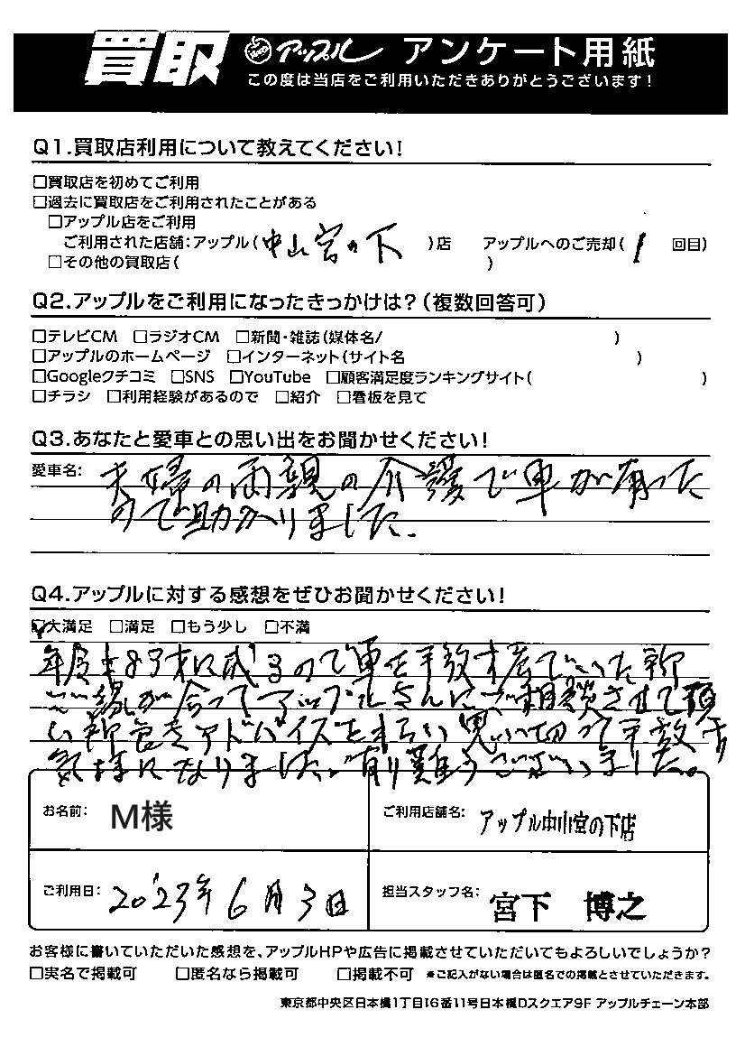 お車のご相談・ 査定だけでもOK! カンタン 入力 30秒 アップルがブランド買取始めました! お電話でも受付中! 受付時間10:00 ~ 19:00(最終受付は18:30となります) 045-929-2211 お車のご相談・ 査定だけでもOK! カンタン 入力 30秒 アップルがブランド買取始めました! お電話でも受付中! 受付時間10:00 ~ 19:00(最終受付は18:30となります) 045-929-2211 アップルがブランド買取始めました! お電話でも受付中! 受付時間10:00 ~ 19:00(最終受付は18:30となります) 045-929-2211 店舗情報 在庫車 スタッフ紹介 ブログ お客様の声 キャンペーン お得 無料査定 click お客様の声 ご記入日: 2023/06/03 横浜市 M様 車名:日産 デイズ M様の御両親の介護訪問でお車をお使い頂いていらっしゃいました。施設に入られるのをきっかけに愛車を手放される決断をされましたね。お疲れ様でした。大切な思い出の詰まった愛車をお譲り頂きましてありがとうございました。 前へ 次へ お客様の声一覧を見る