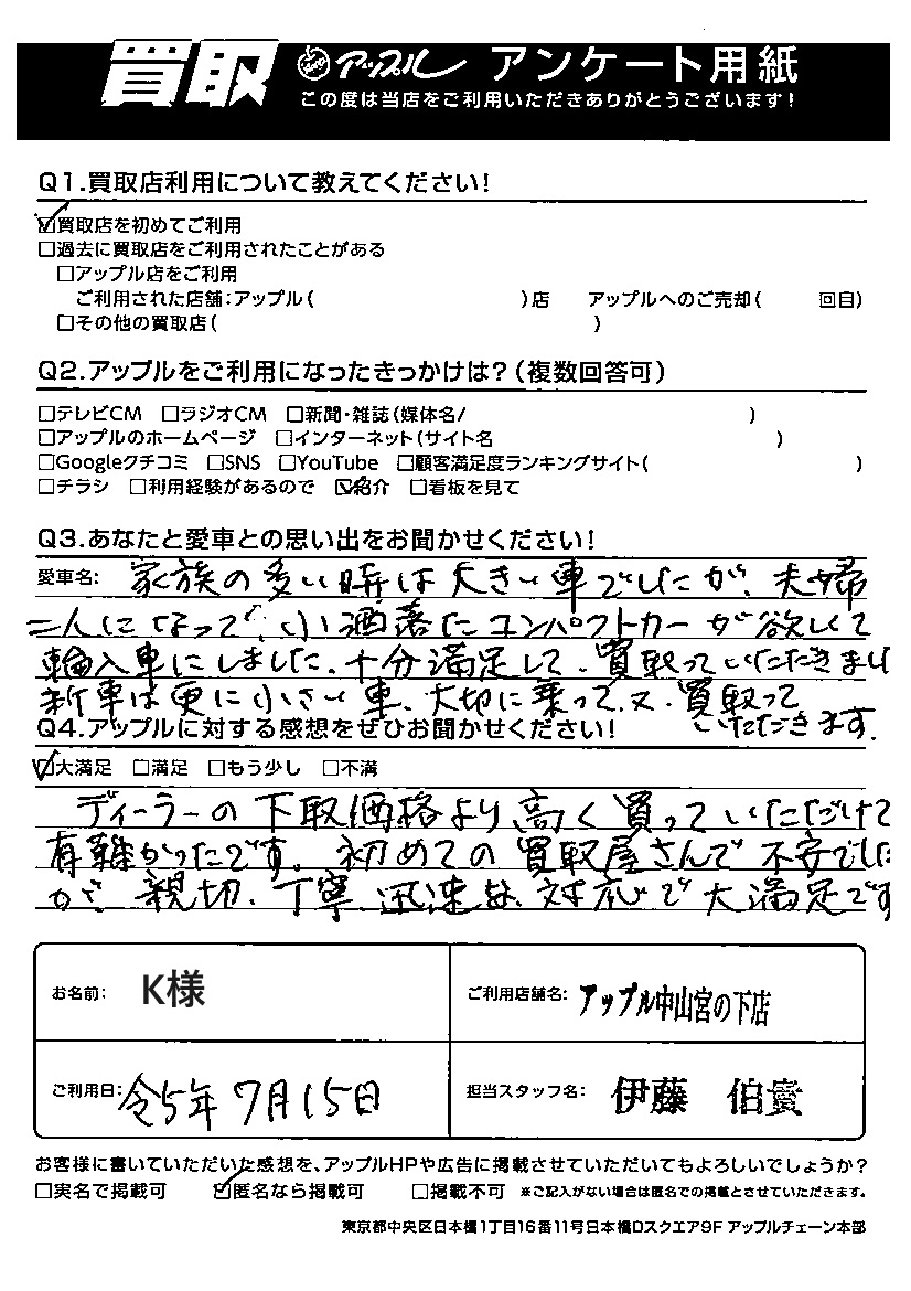 お車のご相談・ 査定だけでもOK! カンタン 入力 30秒 アップルがブランド買取始めました! お電話でも受付中! 受付時間10:00 ~ 19:00(最終受付は18:30となります) 045-929-2211 お車のご相談・ 査定だけでもOK! カンタン 入力 30秒 アップルがブランド買取始めました! お電話でも受付中! 受付時間10:00 ~ 19:00(最終受付は18:30となります) 045-929-2211 アップルがブランド買取始めました! お電話でも受付中! 受付時間10:00 ~ 19:00(最終受付は18:30となります) 045-929-2211 店舗情報 在庫車 スタッフ紹介 ブログ お客様の声 キャンペーン お得 無料査定 click お客様の声 ご記入日: 2023/07/15 K様 車名:プジョー 208 この度は、たくさんある車買取店の中から、アップル中山宮の下店をお選び頂き、誠にありがとうございました。輸入車でけでなく、国産車も高ーく買い取る事ができますので、次回も是非、当店をご利用下さい!! 前へ 次へ お客様の声一覧を見る