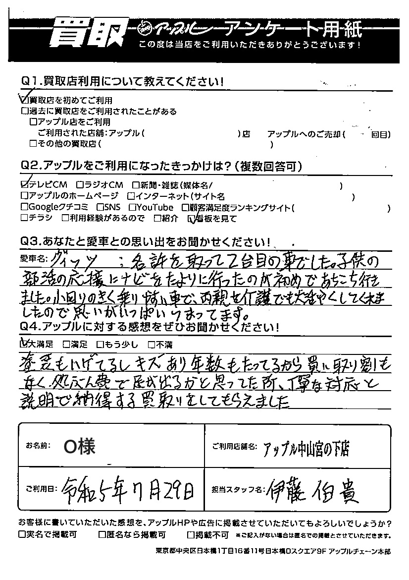 お車のご相談・ 査定だけでもOK! カンタン 入力 30秒 アップルがブランド買取始めました! お電話でも受付中! 受付時間10:00 ~ 19:00(最終受付は18:30となります) 045-929-2211 お車のご相談・ 査定だけでもOK! カンタン 入力 30秒 アップルがブランド買取始めました! お電話でも受付中! 受付時間10:00 ~ 19:00(最終受付は18:30となります) 045-929-2211 アップルがブランド買取始めました! お電話でも受付中! 受付時間10:00 ~ 19:00(最終受付は18:30となります) 045-929-2211 店舗情報 在庫車 スタッフ紹介 ブログ お客様の声 キャンペーン お得 無料査定 click お客様の声 ご記入日: 2023/07/29 O様 車名:トヨタ ヴィッツ この度は、ご家族の思い出がたくさん詰まった、愛車を当店でご売却頂き、誠にありがとうございました。また、このようなアンケート用紙をご返信頂きありがとうございます。次回も機会があれば、是非、アップル中山宮の下をご了承下さい!! 前へ 次へ お客様の声一覧を見る