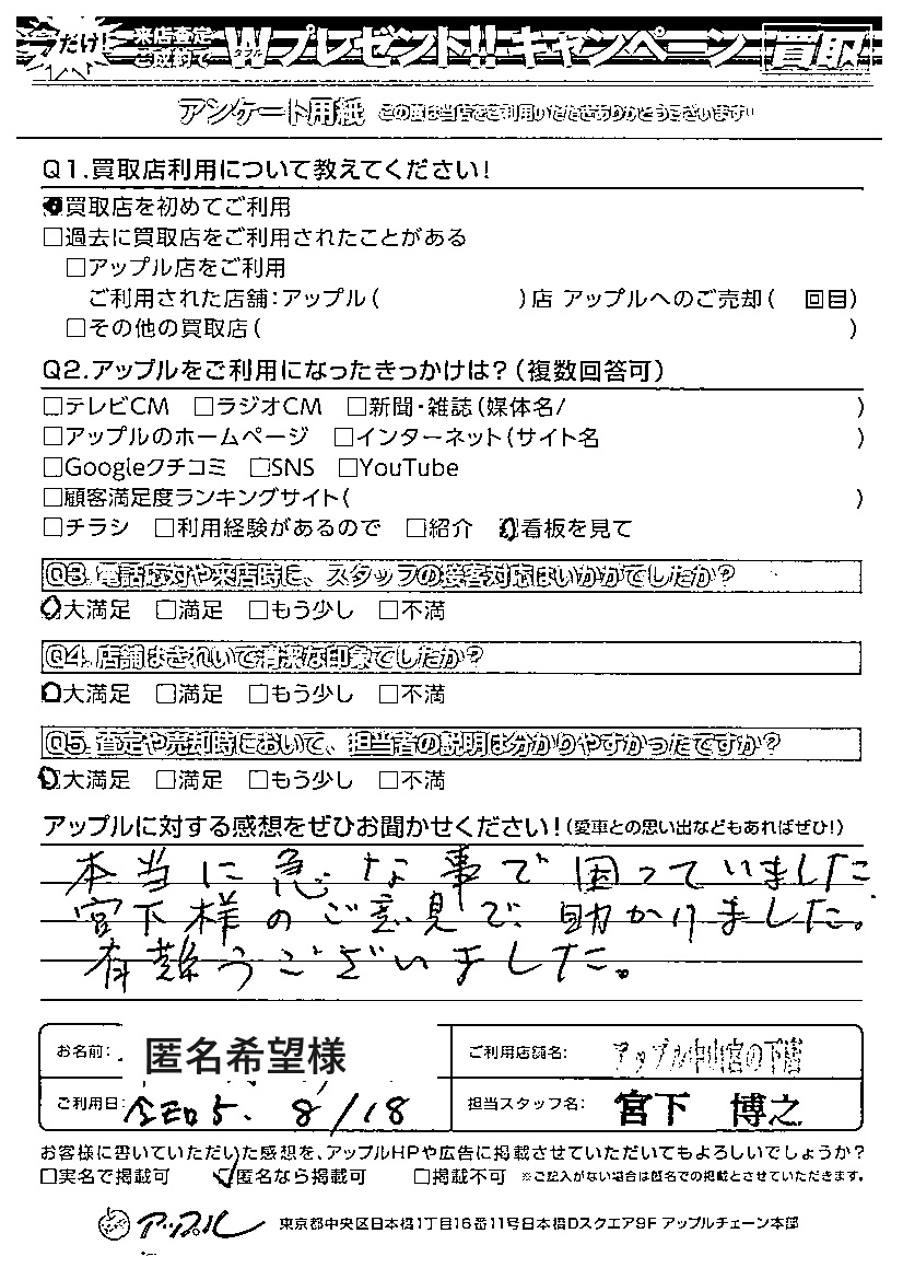 お車のご相談・ 査定だけでもOK! カンタン 入力 30秒 アップルがブランド買取始めました! お電話でも受付中! 受付時間10:00 ~ 19:00(最終受付は18:30となります) 045-929-2211 お車のご相談・ 査定だけでもOK! カンタン 入力 30秒 アップルがブランド買取始めました! お電話でも受付中! 受付時間10:00 ~ 19:00(最終受付は18:30となります) 045-929-2211 アップルがブランド買取始めました! お電話でも受付中! 受付時間10:00 ~ 19:00(最終受付は18:30となります) 045-929-2211 店舗情報 在庫車 スタッフ紹介 ブログ お客様の声 キャンペーン お得 無料査定 click お客様の声 ご記入日: 2023/08/18 横浜市 S様 車名:マツダ CX-8 新車納車が急に早まり愛車のご売却を急いでいらっしゃいました。CX-8のお買取りと入金もスムーズに対応させて頂き無事納車が出来て何よりでした。ご売却いただきましてありがとうございました。 前へ 次へ お客様の声一覧を見る
