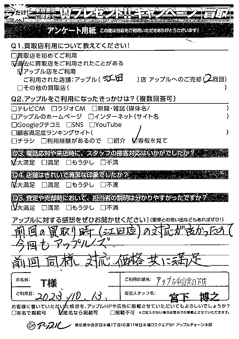 お車のご相談・ 査定だけでもOK! カンタン 入力 30秒 アップルがブランド買取始めました! お電話でも受付中! 受付時間10:00 ~ 19:00(最終受付は18:30となります) 045-929-2211 お車のご相談・ 査定だけでもOK! カンタン 入力 30秒 アップルがブランド買取始めました! お電話でも受付中! 受付時間10:00 ~ 19:00(最終受付は18:30となります) 045-929-2211 アップルがブランド買取始めました! お電話でも受付中! 受付時間10:00 ~ 19:00(最終受付は18:30となります) 045-929-2211 店舗情報 在庫車 スタッフ紹介 ブログ お客様の声 キャンペーン お得 無料査定 click お客様の声 ご記入日: 2024/01/09 T様 ご利用日:2023年10月13日 担当:宮下アップルに対する感想をぜひお聞かせください!前回の買取り時(江田店)の対応が良かったので今回もアップルで前回同様、対応、価格共に満足 前へ 次へ お客様の声一覧を見る