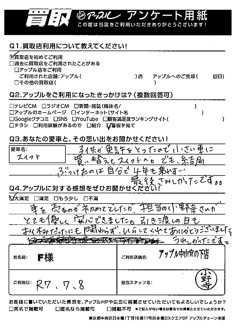 F様 車名:スズキ スイフト