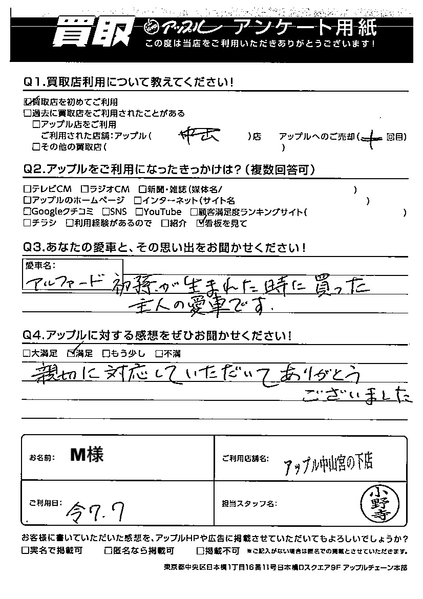 M様 車名:トヨタ アルファード(H27年1月~のHYBRID含む)