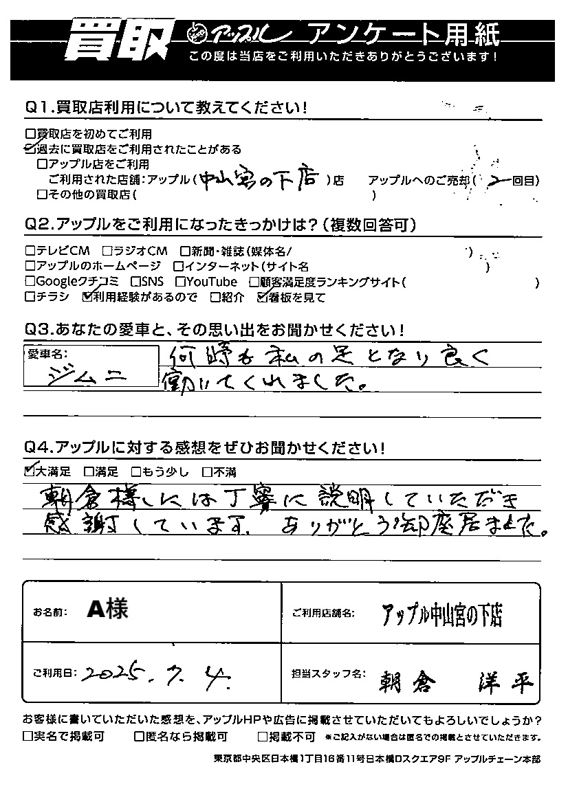 A様 車名:スズキ ジムニー