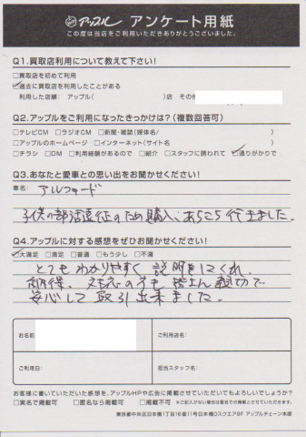 お車のご相談・ 査定だけでもOK! カンタン 入力 30秒 アップルがブランド買取始めました! お電話でも受付中! 受付時間10:00 ~ 19:00(最終受付は18:30となります) 045-929-2211 お車のご相談・ 査定だけでもOK! カンタン 入力 30秒 アップルがブランド買取始めました! お電話でも受付中! 受付時間10:00 ~ 19:00(最終受付は18:30となります) 045-929-2211 アップルがブランド買取始めました! お電話でも受付中! 受付時間10:00 ~ 19:00(最終受付は18:30となります) 045-929-2211 店舗情報 在庫車 スタッフ紹介 ブログ お客様の声 キャンペーン お得 無料査定 click お客様の声 ご記入日: 2018/01/16 N様 とてもわかりやすく説明をしてくれ、納得、対応の方も皆さん親切で安心して取引できました。 前へ 次へ お客様の声一覧を見る