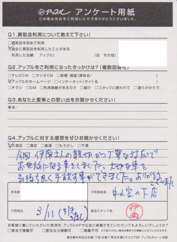お車のご相談・ 査定だけでもOK! カンタン 入力 30秒 アップルがブランド買取始めました! お電話でも受付中! 受付時間10:00 ~ 19:00(最終受付は18:30となります) 045-929-2211 お車のご相談・ 査定だけでもOK! カンタン 入力 30秒 アップルがブランド買取始めました! お電話でも受付中! 受付時間10:00 ~ 19:00(最終受付は18:30となります) 045-929-2211 アップルがブランド買取始めました! お電話でも受付中! 受付時間10:00 ~ 19:00(最終受付は18:30となります) 045-929-2211 店舗情報 在庫車 スタッフ紹介 ブログ お客様の声 キャンペーン お得 無料査定 click お客様の声 ご記入日: 2018/03/11 I様 今回、伊南さんの親切かつ丁寧な対応でお世話になることとしました。大切な車を気持ちよく手放すことができました。ありがとうございました。 前へ 次へ お客様の声一覧を見る