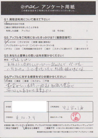 お車のご相談・ 査定だけでもOK! カンタン 入力 30秒 アップルがブランド買取始めました! お電話でも受付中! 受付時間10:00 ~ 19:00(最終受付は18:30となります) 045-929-2211 お車のご相談・ 査定だけでもOK! カンタン 入力 30秒 アップルがブランド買取始めました! お電話でも受付中! 受付時間10:00 ~ 19:00(最終受付は18:30となります) 045-929-2211 アップルがブランド買取始めました! お電話でも受付中! 受付時間10:00 ~ 19:00(最終受付は18:30となります) 045-929-2211 店舗情報 在庫車 スタッフ紹介 ブログ お客様の声 キャンペーン お得 無料査定 click お客様の声 ご記入日: 2018/03/09 O様 むずかしい手続きに関する知識も豊富で安心しておまかせ出来ました。 前へ 次へ お客様の声一覧を見る