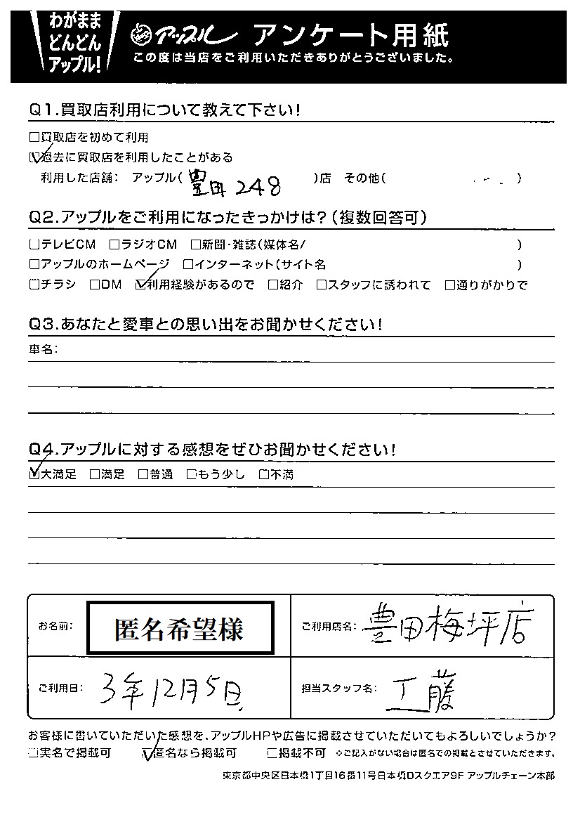 お車のご相談・ 査定だけでもOK! カンタン 入力 30秒 アップルがブランド買取始めました! お電話でも受付中! 受付時間09:30 ~ 18:00 0565-35-6767 お車のご相談・ 査定だけでもOK! カンタン 入力 30秒 アップルがブランド買取始めました! お電話でも受付中! 受付時間09:30 ~ 18:00 0565-35-6767 アップルがブランド買取始めました! お電話でも受付中! 受付時間09:30 ~ 18:00 0565-35-6767 店舗情報 在庫車 スタッフ紹介 ブログ お客様の声 キャンペーン お得 無料査定 click お客様の声 ご記入日: 2021/12/05 匿名希望様 Q アップルに対する感想をぜひお聞かせください!感想:大満足 前へ 次へ お客様の声一覧を見る