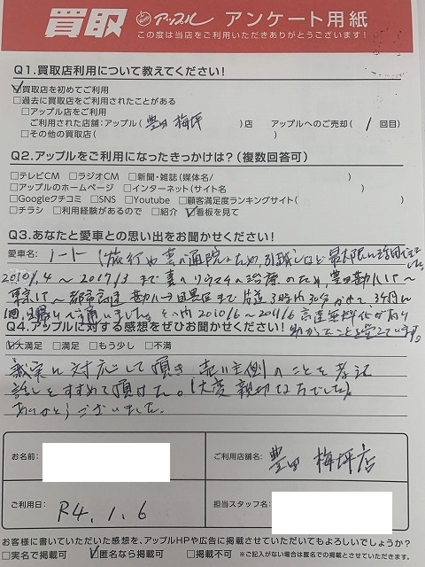 お車のご相談・ 査定だけでもOK! カンタン 入力 30秒 アップルがブランド買取始めました! お電話でも受付中! 受付時間09:30 ~ 18:00 0565-35-6767 お車のご相談・ 査定だけでもOK! カンタン 入力 30秒 アップルがブランド買取始めました! お電話でも受付中! 受付時間09:30 ~ 18:00 0565-35-6767 アップルがブランド買取始めました! お電話でも受付中! 受付時間09:30 ~ 18:00 0565-35-6767 店舗情報 在庫車 スタッフ紹介 ブログ お客様の声 キャンペーン お得 無料査定 click お客様の声 ご記入日: 2022/01/06 T様 車名:日産 ノート 誠実に対応して頂き売主側のことを考えて話を進めていただけた。大変親切な方でした。ありがとうございました。 前へ 次へ お客様の声一覧を見る