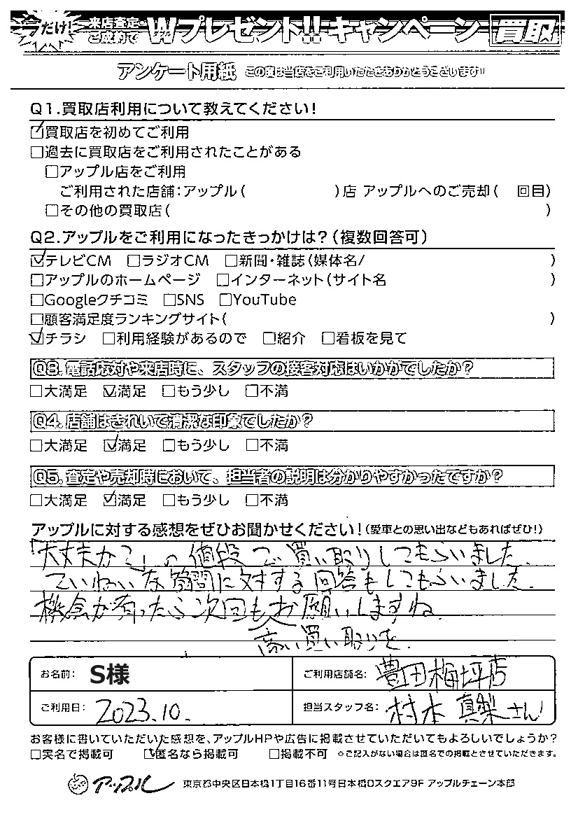 お車のご相談・ 査定だけでもOK! カンタン 入力 30秒 アップルがブランド買取始めました! お電話でも受付中! 受付時間09:30 ~ 18:00 0565-35-6767 お車のご相談・ 査定だけでもOK! カンタン 入力 30秒 アップルがブランド買取始めました! お電話でも受付中! 受付時間09:30 ~ 18:00 0565-35-6767 アップルがブランド買取始めました! お電話でも受付中! 受付時間09:30 ~ 18:00 0565-35-6767 店舗情報 在庫車 スタッフ紹介 ブログ お客様の声 キャンペーン お得 無料査定 click お客様の声 ご記入日: 2024/01/05 S様 ご利用日:2023年10月 担当:村本真梨「大丈夫か?」の値段で買い取りしてもらいました。ていねいな質問に対する回答もしてもらいました。機会が有ったら次回も高い買い取りをお願いしますね。 前へ 次へ お客様の声一覧を見る