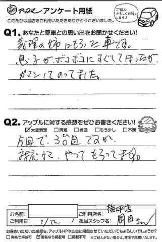お車のご相談・ 査定だけでもOK! カンタン 入力 30秒 アップルがブランド買取始めました! お電話でも受付中! 受付時間09:30 ~ 18:00 0565-35-6767 お車のご相談・ 査定だけでもOK! カンタン 入力 30秒 アップルがブランド買取始めました! お電話でも受付中! 受付時間09:30 ~ 18:00 0565-35-6767 アップルがブランド買取始めました! お電話でも受付中! 受付時間09:30 ~ 18:00 0565-35-6767 店舗情報 在庫車 スタッフ紹介 ブログ お客様の声 キャンペーン お得 無料査定 click お客様の声 ご記入日: 2013/01/30 匿名希望様 【愛車との思い出】義理の姉からもらった車です。息子がボコボコにすぐしてしまったがガマンしてのってました。【アップルに対する感想】今回で3台目ですが、対応して、やってもらってます。 前へ 次へ お客様の声一覧を見る