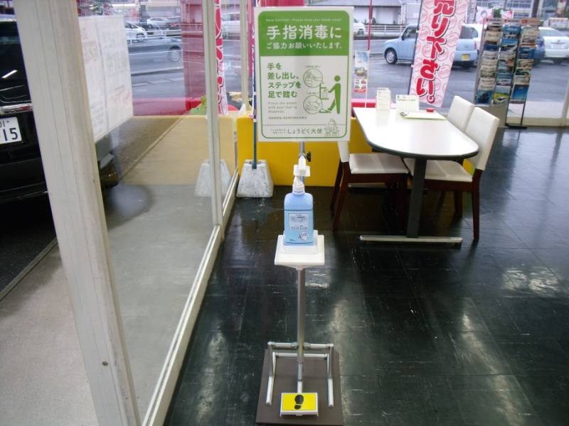 出入口2か所に消毒液の設置、店内ではマスク着用、