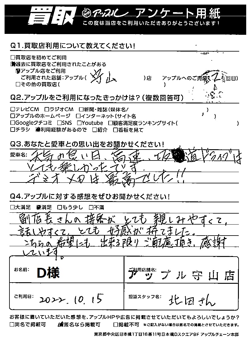 副店長さんの接客がとても親しみやすくて、話しやすくて、とても好感が持てました。こちらの希望にも出来る限りご配慮頂き、感謝しています。