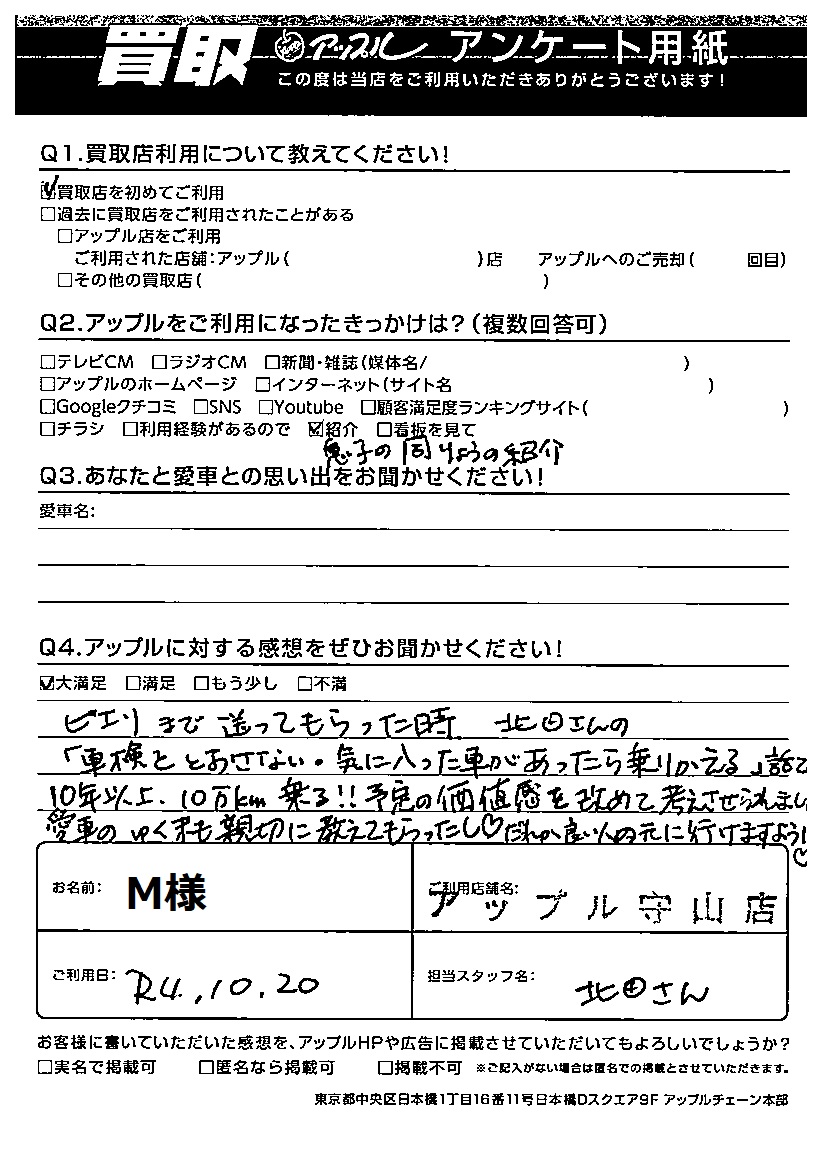 10年以上、10万㎞乗る!!予定の価値感を改めて考えさせられました。愛車のゆく末も親切に教えてもらったし♡だれか良い人の元に行けますように!