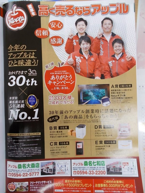 お車のご相談・ 査定だけでもOK! カンタン 入力 30秒 アップルがブランド買取始めました! お電話でも受付中! 受付時間10:00 ~ 19:00 0594-33-2200 お車のご相談・ 査定だけでもOK! カンタン 入力 30秒 アップルがブランド買取始めました! お電話でも受付中! 受付時間10:00 ~ 19:00 0594-33-2200 アップルがブランド買取始めました! お電話でも受付中! 受付時間10:00 ~ 19:00 0594-33-2200 店舗情報 在庫車 スタッフ紹介 ブログ お客様の声 キャンペーン 無料査定 click [ 未分類 ] 2019/03/04 (月) 17:09 ☆お知らせ☆ 皆様こんにちは!!店長の太田です☆本日はお知らせがございます!!ポロン3月号にアップル桑名七和店が載っております♪♪ポロン持参で査定のお客様にクオカード500円分プレゼント☆☆さらにご成約のお客様に、お食事券5000円分プレゼント☆☆是非この機会にアップル桑名七和店にお越しください♪♪お客様のご来店心よりお待ちしております(^o^)明日、明後日は定休日になります!!ご迷惑お掛け致しますがよろしくお願い致します!! 2019-03-04 17:09:45 新しい記事へ 古い記事へ 最新記事 ポップアップストア♪♪キャンペーン最終日♪♪☆残り僅か☆☆祝27周年☆キャンペーン★ 店舗情報に戻る 月別アーカイブ 2026年04月(1)2026年03月(2)2026年02月(2)2026年01月(3)2025年12月(5)2025年11月(4)2025年10月(3)2025年09月(6)2025年08月(6)2025年07月(7)2025年06月(21)2025年05月(20)2025年04月(6)2025年03月(1)2025年02月(5)2025年01月(4)2024年12月(6)2024年11月(3)2024年10月(5)2024年09月(4)2024年08月(5)2024年07月(8)2024年06月(3)2024年05月(4)2024年04月(5)2024年03月(3)2024年02月(4)2024年01月(4)2023年12月(5)2023年11月(5)2023年10月(3)2023年09月(9)2023年08月(7)2023年07月(5)2023年06月(4)2023年05月(2)2023年04月(3)2023年03月(1)2023年02月(1)2023年01月(2)2022年12月(4)2022年11月(1)2022年10月(3)2022年09月(8)2022年08月(4)2022年07月(4)2022年06月(3)2022年05月(3)2022年04月(6)2022年03月(2)2022年02月(3)2022年01月(5)2021年12月(6)2021年11月(5)2021年10月(6)2021年09月(7)2021年08月(8)2021年07月(6)2021年06月(5)2021年05月(3)2021年04月(4)2021年03月(4)2021年02月(8)2021年01月(6)2020年12月(4)2020年11月(3)2020年10月(4)2020年09月(6)2020年08月(6)2020年07月(7)2020年06月(7)2020年05月(5)2020年04月(8)2020年03月(5)2020年02月(10)2020年01月(6)2019年12月(8)2019年11月(6)2019年10月(8)2019年09月(6)2019年08月(7)2019年07月(5)2019年06月(4)2019年05月(4)2019年04月(4)2019年03月(3)2019年02月(3)2018年12月(3)2018年11月(3)2018年10月(5)2018年09月(6)2018年08月(5)2018年07月(5)2018年06月(4)2018年05月(4)2018年04月(7)2018年03月(5)2018年02月(3)2018年01月(4)2017年12月(5)2017年11月(4)2017年10月(4)2017年09月(3)2017年08月(4)2017年07月(4)2017年06月(2)2017年05月(4)2017年04月(4)2017年03月(2)2017年02月(2)2017年01月(3)2016年12月(3)2016年11月(2)2016年10月(3)2016年09月(4)2016年08月(9)2016年07月(2)2016年06月(4)2016年05月(2)2016年04月(4)2016年02月(2)2016年01月(3)2015年12月(2)2015年10月(1)2015年09月(1)2015年08月(3)2015年07月(3)2015年06月(2)2015年05月(2)2015年04月(3)2015年03月(1)2015年02月(1)2015年01月(3)2014年12月(3)2014年11月(2)2014年10月(2)2014年09月(5)2014年08月(3)2014年07月(3)2014年06月(3)2014年05月(6)2014年04月(2)2014年01月(2)2013年12月(1)2013年11月(2)2013年09月(1)