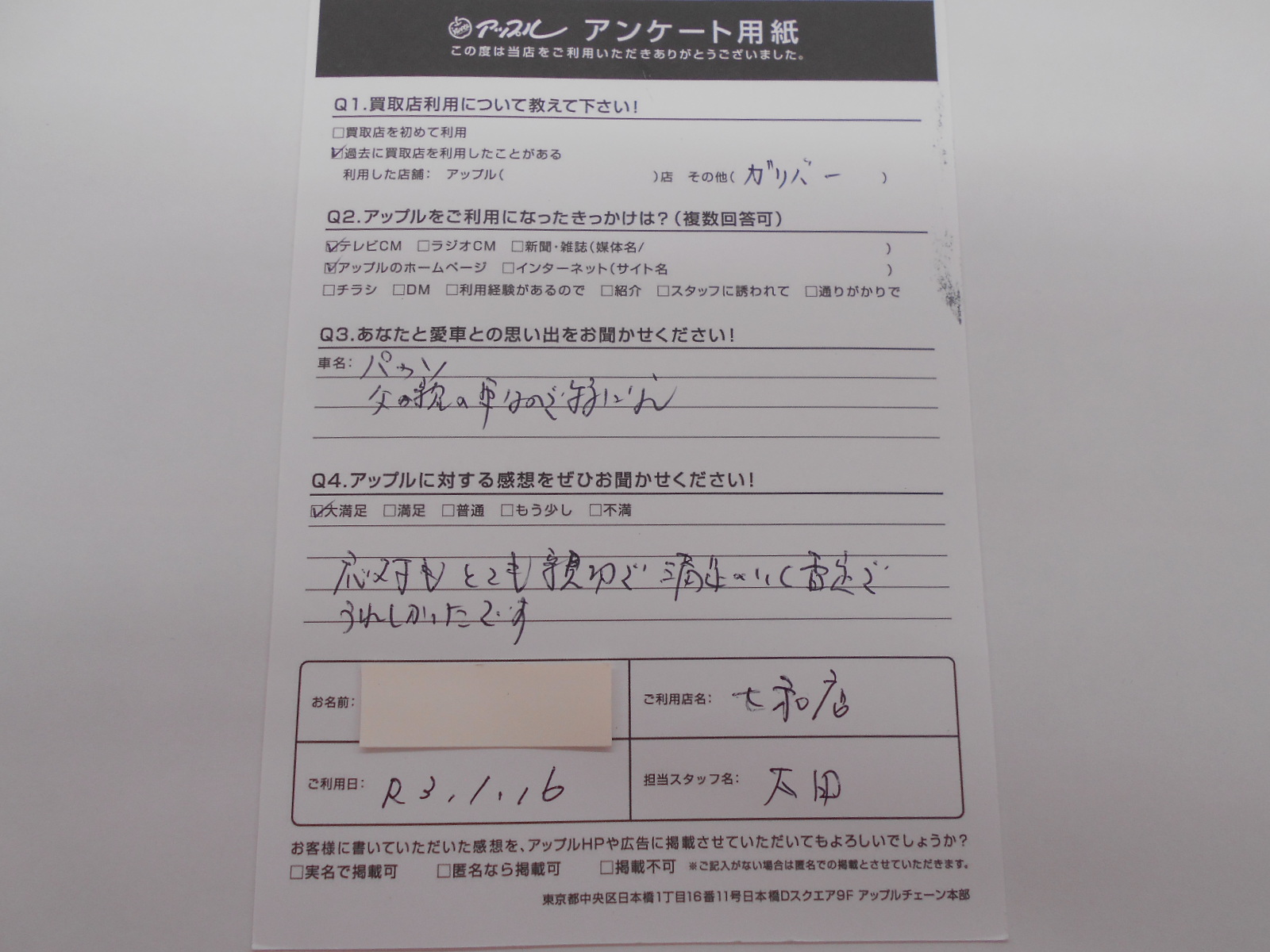 お車のご相談・ 査定だけでもOK! カンタン 入力 30秒 アップルがブランド買取始めました! お電話でも受付中! 受付時間10:00 ~ 19:00 0594-33-2200 お車のご相談・ 査定だけでもOK! カンタン 入力 30秒 アップルがブランド買取始めました! お電話でも受付中! 受付時間10:00 ~ 19:00 0594-33-2200 アップルがブランド買取始めました! お電話でも受付中! 受付時間10:00 ~ 19:00 0594-33-2200 店舗情報 在庫車 スタッフ紹介 ブログ お客様の声 キャンペーン 無料査定 click お客様の声 ご記入日: 2021/01/16 匿名希望パッソ様 対応もとても親切で満足のいく査定でうれしかったです。 前へ 次へ お客様の声一覧を見る
