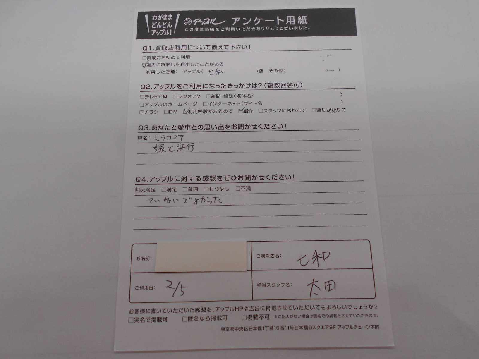 お車のご相談・ 査定だけでもOK! カンタン 入力 30秒 アップルがブランド買取始めました! お電話でも受付中! 受付時間10:00 ~ 19:00 0594-33-2200 お車のご相談・ 査定だけでもOK! カンタン 入力 30秒 アップルがブランド買取始めました! お電話でも受付中! 受付時間10:00 ~ 19:00 0594-33-2200 アップルがブランド買取始めました! お電話でも受付中! 受付時間10:00 ~ 19:00 0594-33-2200 店舗情報 在庫車 スタッフ紹介 ブログ お客様の声 キャンペーン 無料査定 click お客様の声 ご記入日: 2021/02/05 匿名希望ミラココア様 ていねいでよかった。 前へ 次へ お客様の声一覧を見る